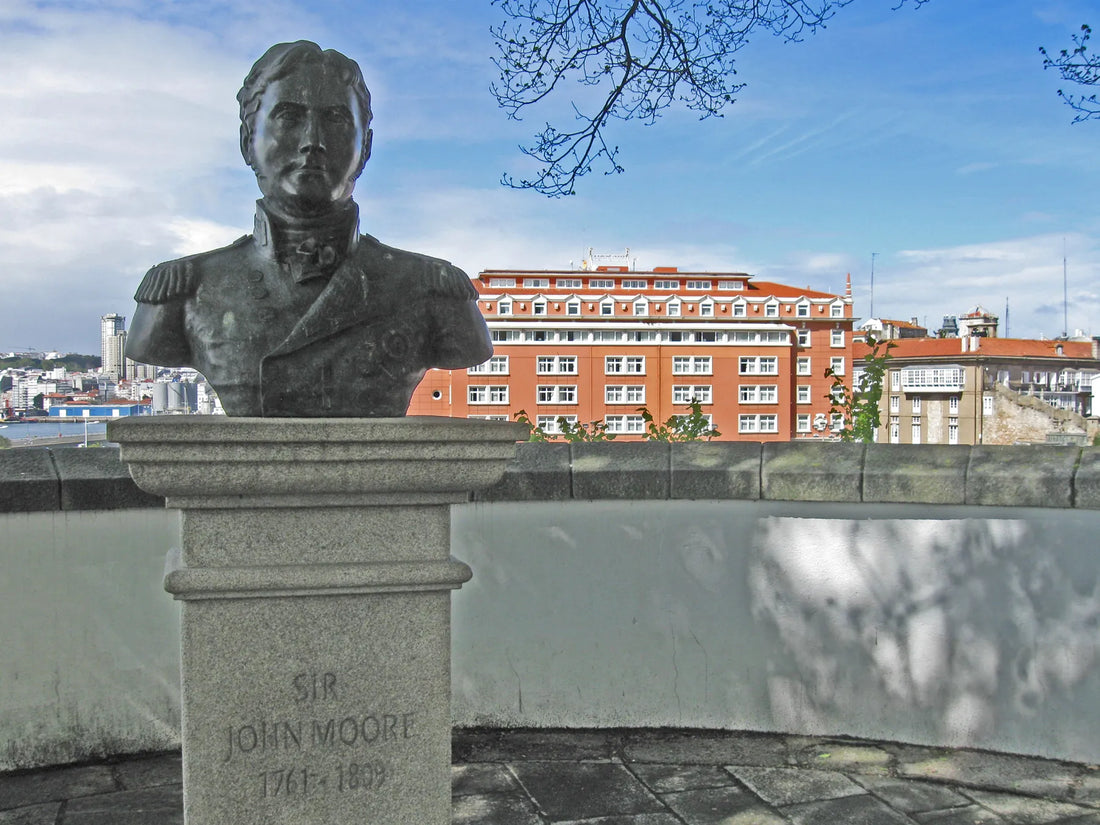 Their French opponents, though, thought the battle hard-fought and Moore worthy of respect. After they took La Coruña, their general, Marshal Soult, ordered a monument be built over Moore’s grave; this monument was rebuilt and made more permanent in 1811. Now, a small park encloses the current monument. A bust of Moore at the edge of the park has a fine view of the port and the defensive castle that juts into it (third photo).